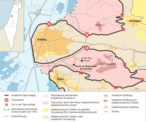 Zwischen dem Dörfchen Arab ar-Ramadin und der benachbarten palästinensischen Stadt Kalkilja wurde 2002 das erste Teilstück der Sperranlage errichtet, die einst 700 Kilometer lang werden soll – offiziell, um palästinensischen TerroristInnen das Eindringen nach Israel zu erschweren. Die Zahl der Attentate ist tatsächlich signifikant zurückgegangen. Doch wurde die Anlage offenbar noch aus einem anderen Grund gebaut. Zu 85 Prozent verläuft sie nämlich nicht entlang der israelischen Staatsgrenze, sondern auf palästinensischem Gebiet – und zwar so, dass viele israelische Siedlungen direkt mit dem Staatsgebiet Israels verbunden sind. Der Internationale Gerichtshof in Den Haag sprach 2005 in einem Gutachten von einer «De-facto-Annexion» besetzten Gebiets.