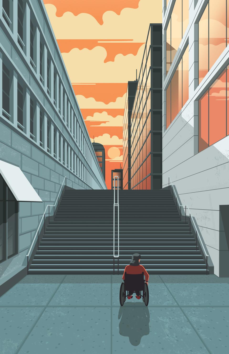 Seit 2004 besitzt die Schweiz ein Behindertengleichstellungsgesetz (BehiG, vgl. «Was heisst ‹verhältnismässig›?» im Anschluss an diesen Text), das einen barrierefreien Zugang zu Gebäuden vorschreibt, die nach diesem Zeitpunkt bewilligt und erstellt oder umgebaut wurden. Susanne arbeitet im Gesundheitswesen und hat öfter im 2014 eröffneten Campus der Pädagogischen Hochschule zu tun. Wenn man vom Zürcher Hauptbahnhof kommt, steht man zuallererst vor einer zwanzigstufigen Treppe, deren Stufen motivierende Begriffe zieren: «Konstruieren», «Bewegen», «Anregen», «Fördern» … – ein Willkommengruss, der sich aus der Rollstuhlperspektive schräg anfühlt. Erst wer sich nach rechts wendet, sieht die Tür für den Rollstuhlzugang, am Ende eines langen Gangs führt dann ein Lift hoch auf den Campus.