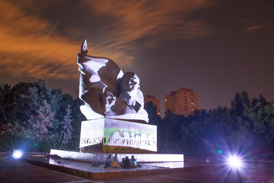 Das Kunstduo A. S. S. Collective lagert mit befreundeten AktivistInnen vor dem ramponierten Denkmal des Kommunistenführers, der dem Park hier seinen Namen gab, und hofft auf einen «Blitz des Erwachens». In seinem Kurzfilm «Dawn of the Red» (2018) steht das Monument beispielhaft für den stiefmütterlichen Umgang der Stadt mit den Überbleibseln ihrer realsozialistischen Vergangenheit: Nach der Wende mussten die Schrifttafeln weg, die Flutlichter blieben aus. Das Denkmal symbolisiert aber auch die politische Kraft, die in solchen Monumenten steckt. Nur, wie lässt sich diese Kraft freisetzen? Wie kann eine tonnenschwere Bronzebüste, die inmitten von Scherben und Kippen mit geballter Faust auf einem beschmierten Sockel thront, von ihrem Kontext und ihrer Geschichte isoliert werden? Mit Taschenlampen? Einer mobilen Flutlichtanlage? Oder reicht die Analyse bei einer Flasche Bier?