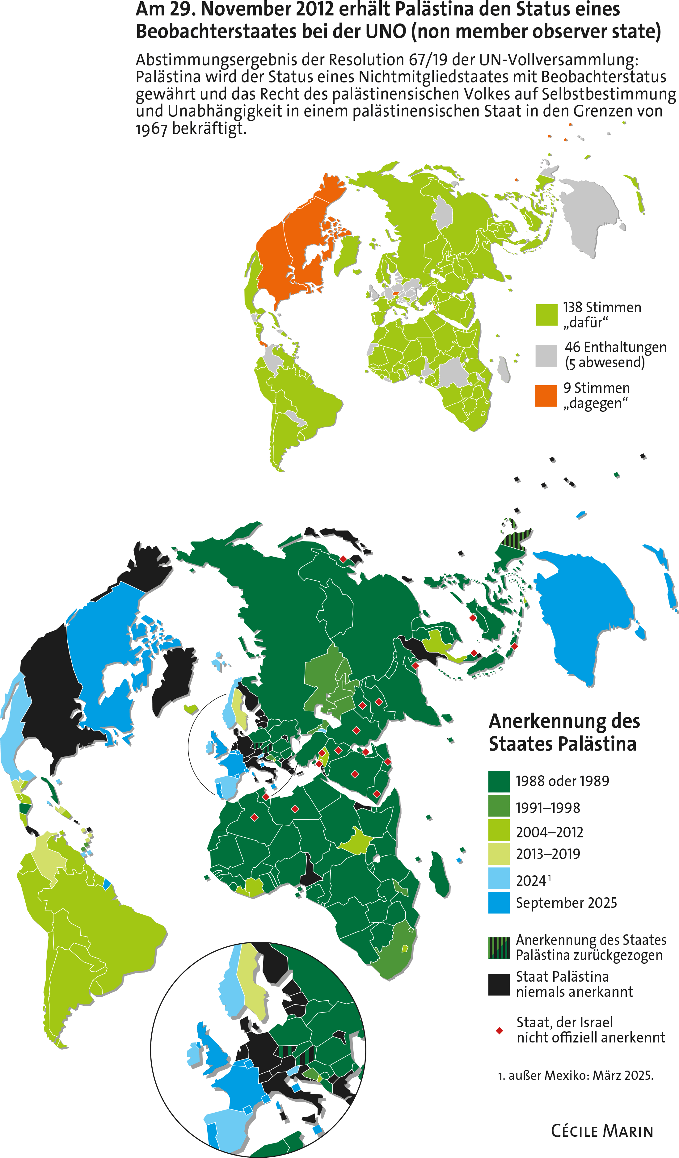 Zu früh? Die Zerstörung des Gazastreifens war ja erst acht Monate im Gange; die Anerkennung Palästinas durch Schweden war ja erst zehn Jahre her; die Palästinenser selbst hatten ihre Unabhängigkeit auch erst vor 36 Jahren erklärt. Und richtig: Im Mai 2024 hatten erst rund 75 Prozent der UN-Mitgliedstaaten die Anerkennung vollzogen. Da konnte der französische Präsident gut noch etwas zuwarten.