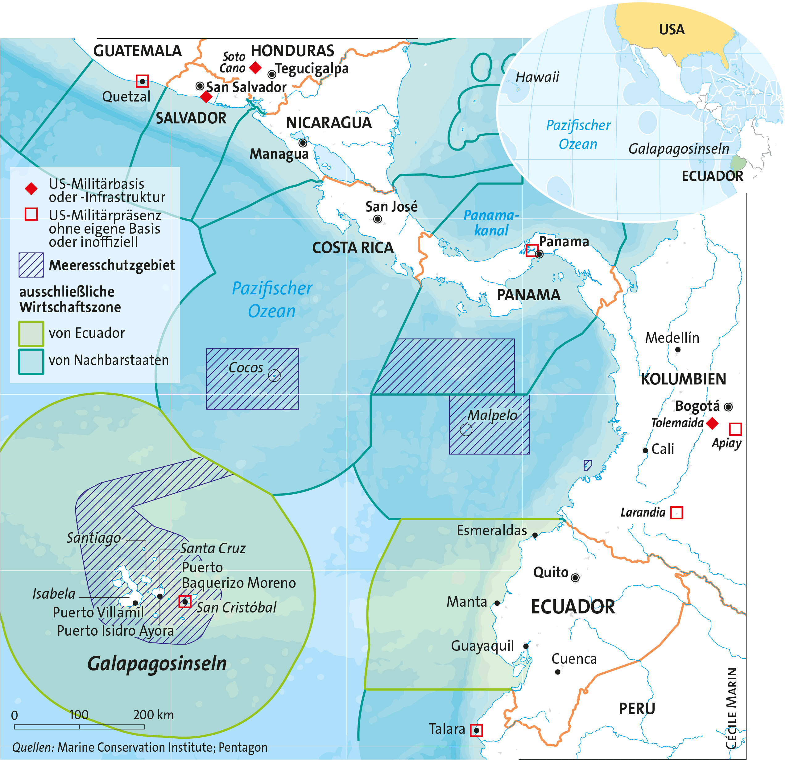 Diese Einschätzung teilt auch der altgediente Diplomat Francisco Carrión, der unter anderem Außenminister Ecuadors (2005–2007) und Botschafter in Washington (2017–2020) war: Der Archipel könne „die Sicherung eines Dreiecks ermöglichen, das von der ecuadorianischen Küste bis zu den Galapagosinseln und von dort bis nach Mittelamerika reicht“.